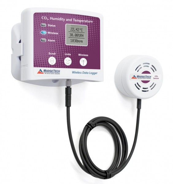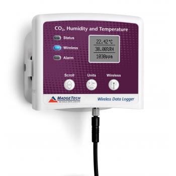 The RFCO2RHTemp2000A is a wireless data logger that measures and records carbon dioxide, humidity, and temperature levels in a variety of applications. This data logger is ideal for use in air quality studies including HVAC applications and much more. The RFCO2RHTemp2000A data logger comes with a 16 ft cable connected to the CO2 sensor, making it ideal for placement within enclosed environments such as an incubator to ensure optimum levels. The logger features an LCD screen which provides instant access to current readings, as well as minimum, maximum, and average statistics. The device also features configurable alarms, battery life indicator, and the ability to reset statistics without impacting the data collection. The logger features a convenient wall mount, while the CO2 sensor is equipped with dual lock for easy and secure placement and effortless mobility. Temperature recorded on the RFCO2RHTemp2000A can be expressed in °C, °F, °R, or K while humidity can be shown in %RH, mg/ml, and Dew Point. Carbon dioxide can be expressed as either ppm or as a percentage. All units can be viewed on both the LCD screen as well as in the software. The device can be used to determine ventilation efficiency in a variety of environments including buildings, offices, hospitals, schools, and laboratories. By determining the levels of carbon dioxide, improvements can be made to the ventilation systems and energy saving opportunities become more easily identified. The RFCO2RHTemp2000A can be used as a standalone data logger, or may used wirelessly to transmit collected data back to a central PC for real time monitoring. The RFCO2RHTemp2000A can be used as a single wireless data logging system, or can be expanded to a large scale system including hundreds of data loggers. The RFCO2RHTemp2000A utilizes the latest version of the MadgeTech 4 Data Logger Software to analyze data or generate reports in graphs or tabular formats. Summary and statistic views are also available for further analysis, as well as the capability to export to Excel.