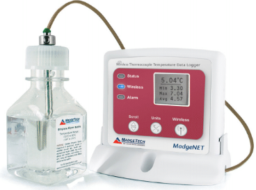 MadgeTech’s Vaccine Temperature Monitoring System (VTMS) is ideal for the continuous measure-ment and data logging of temperature sensitive vaccines or pharmaceuticals in refrigerators, freezers, and coolers. The system includes an NIST traceable RFTCTemp2000A data logger with thermocouple and Glycol bottle. Additionally, the RFTCTemp2000A data logger in the VTMS system has a convenient LCD to ensure temperature parameters are met, in real time. Starting, stopping and downloading from the device are all performed wirelessly using the RFC1000 wireless transceiver. The current reading, minimum, maximum and average statistics can all be obtained through the display.