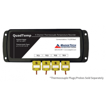 The QuadTemp is a four channel thermocouple data logger with a reading rate of up to 4 Hz. It can measure and record 500,000 readings per channel. To maximize memory capacity, users can enable or disable channels. For easy identification, each channel can be named with up to a ten digit title.
