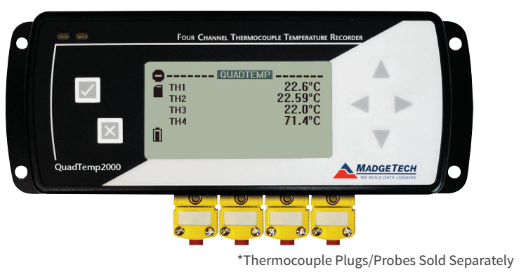 The QuadTemp2000 is a four channel thermocouple data logger with an LCD. The device features onscreen minimum, maximum and average statistics, as well as a user configurable graphics screen that allows for any combination of channels to be displayed. The device accepts J, K, T, E, R, S, B and N type thermocouples.