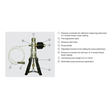 If one connects the test item and a sufficiently accurate reference measuring instrument to the hand test pump, on actuating the pump, the same pressure will act on both measuring instruments. By comparison of the two measured values at any given pressure value, a check of the accuracy and/or adjustment of the test item can be carried out. In order to approach the measuring points exactly, the hand test pump features a fine adjustment valve.