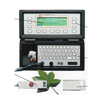 The innovative design of the AP4 provides users with logical, convenient operation and a comprehensive range of features and functions. In particular, the AP4 offers an automated, rapid cycle that gives temperaturecompensated readings, and straightforward calibration. New users can quickly make effective use of the AP4, without a deep knowledge of all the options available to the more experienced user. In use, the AP4 is carried on a shoulder strap in its own protective carrying case, with the keyboard, control buttons and display at a convenient working level. The sensor head, on a flexible cable, is simply clipped on to the leaf to be measured. Once the instrument has been initialised, a READ button on the head allows singlehanded operation. Successive readings can be taken, evaluated and stored just by pressing this one button. Stable readings are audibly indicated by a ‘double beep’. Step-by-step procedures from menus displayed on the LCD screen guide the user through the processes of calibration, taking readings, and the review and output of stored data. A SET button conveniently recalls operating settings stored previously.