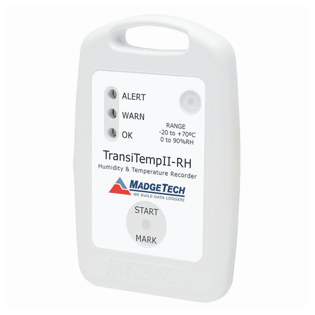 The TransiTempII-RH is a stand alone, rugged humidity and temperature recorder. This device is ideal for monitoring and recording the temperature and humidity of products during storage and shipping. No external probes are required to achieve its high performance as both the temperature and humidity sensors are internal to the device. The TransiTempII-RH has a humidity resolution of 0.1% RH and typical accuracy of ±3.5% RH at25°C. It can record up to 16,383 readings per channel. The TransiTempII-RH is equipped with three status LED red/green/yellow indicators. It can be programmed through software to start immediately, delayed start for up to 30 days, or be set to start using the magnetic switch. With the MadgeTech user-friendly software, the data can be displayed with a variety of different configurable options. Users have the ability to view temperature data in degrees Celsius, Fahrenheit, Kelvin or Rankine. Humidity readings can be displayed in %RH, water vapor concentration or even dew point. For additional analysis, data can be easily exported to MS Excel® by simply clicking a button.